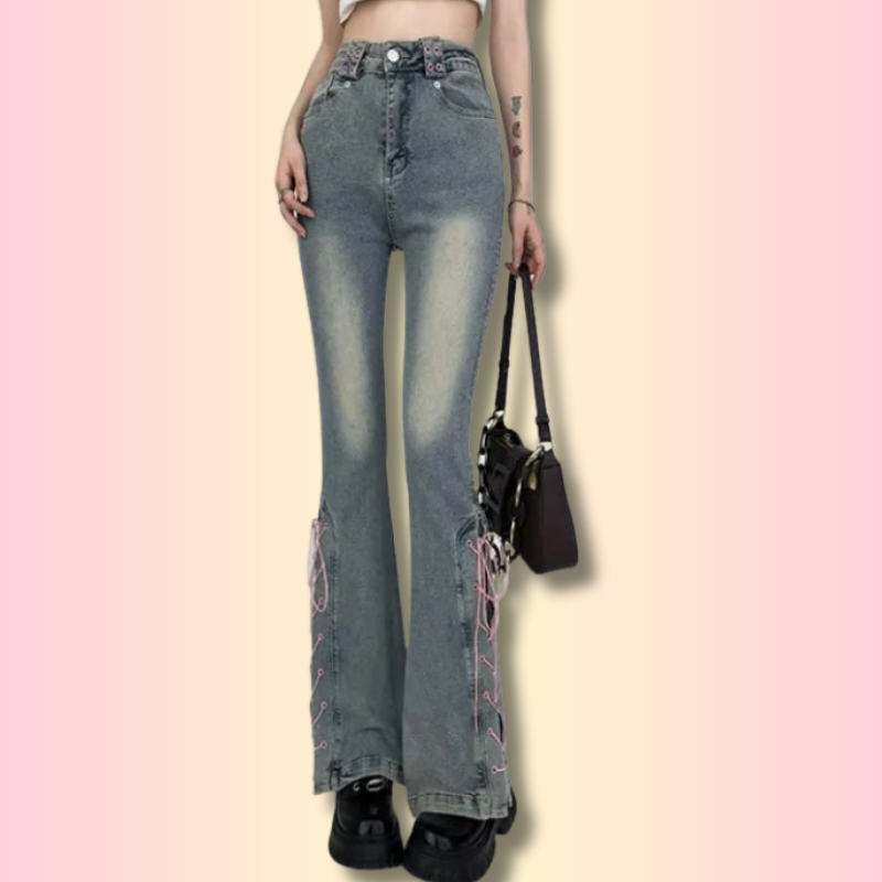 Ce jean flare kawaii est la pièce parfaite pour celles qui cherchent à allier élégance et originalité. Avec sa coupe flare emblématique, ce jean allonge visuellement vos jambes tout en offrant un style unique grâce à ses détails lacés au niveau des chevilles. Il vous permet de vous démarquer avec une allure à la fois audacieuse et adorable.