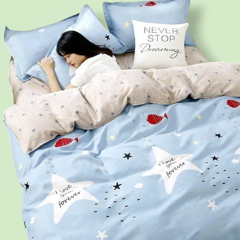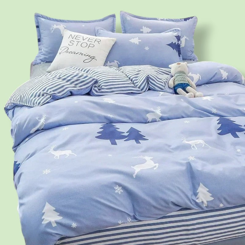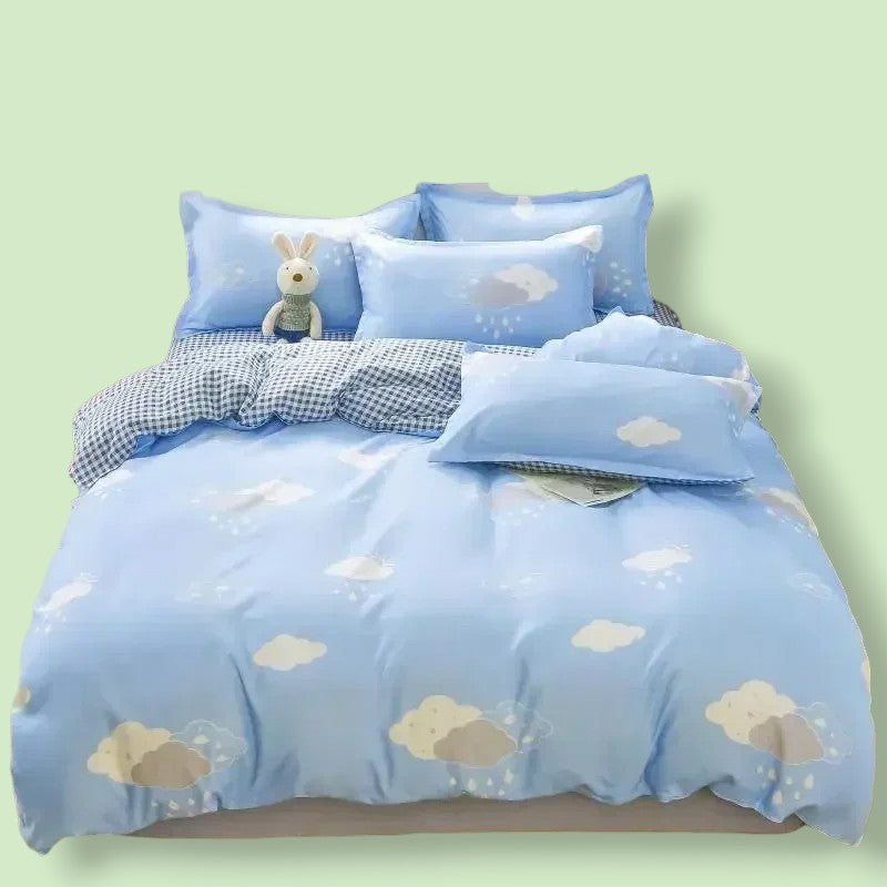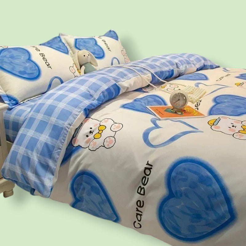 The kawaii blue bedding set brings a fresh and stylish touch to your bedroom with its trendy print, making it the perfect blend of comfort and design. Crafted from soft, breathable fabric, it ensures a cozy sleep experience while adding a playful charm to your space. Easy to care for and durable, this bedding set lets you enjoy both fashion and function every night.