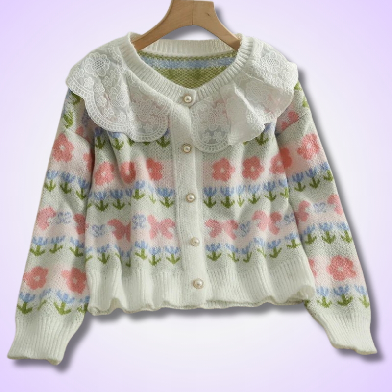Add a touch of charm to your wardrobe with this kawaii floral cardigan, a beautifully detailed floral cardigan featuring a delicate lace collar that brings elegance to everyday comfort. Soft, feminine, and effortlessly stylish, this piece blends cozy warmth with refined kawaii aesthetics.