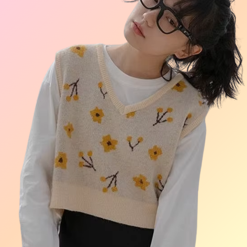 Featuring a flattering cropped cut and adorned with delicate floral patterns, our crop knitted vest blends cute design with a trendy silhouette. Perfect for layering over blouses, dresses, or wearing on its own during warmer days, this vest adds a fresh and feminine touch to your look.