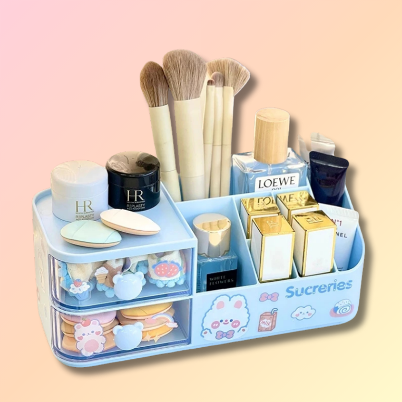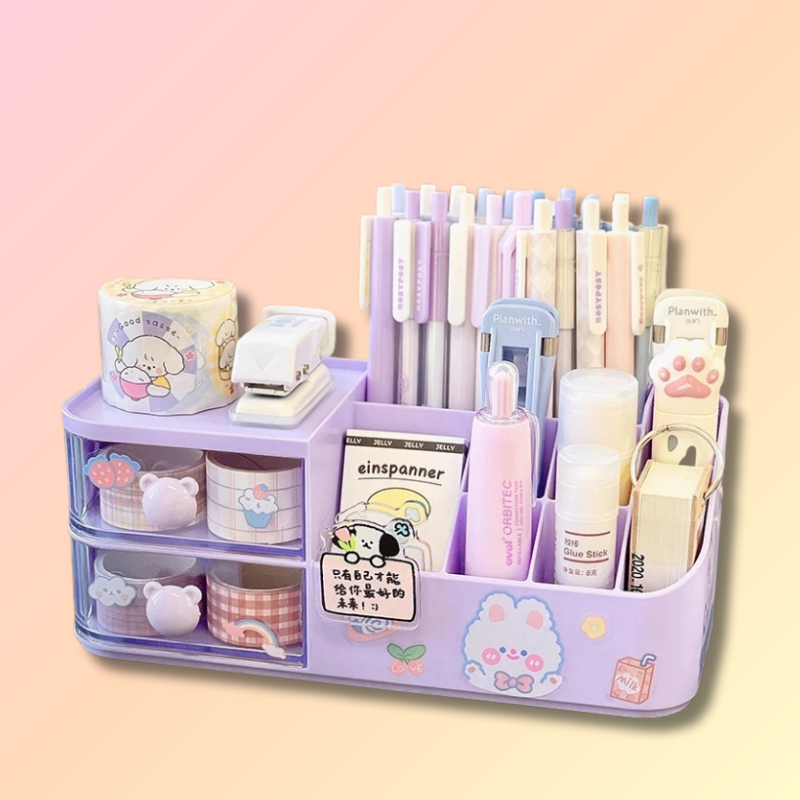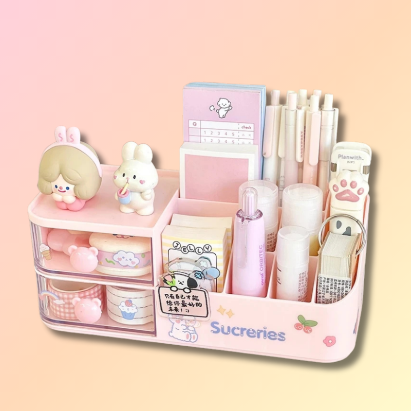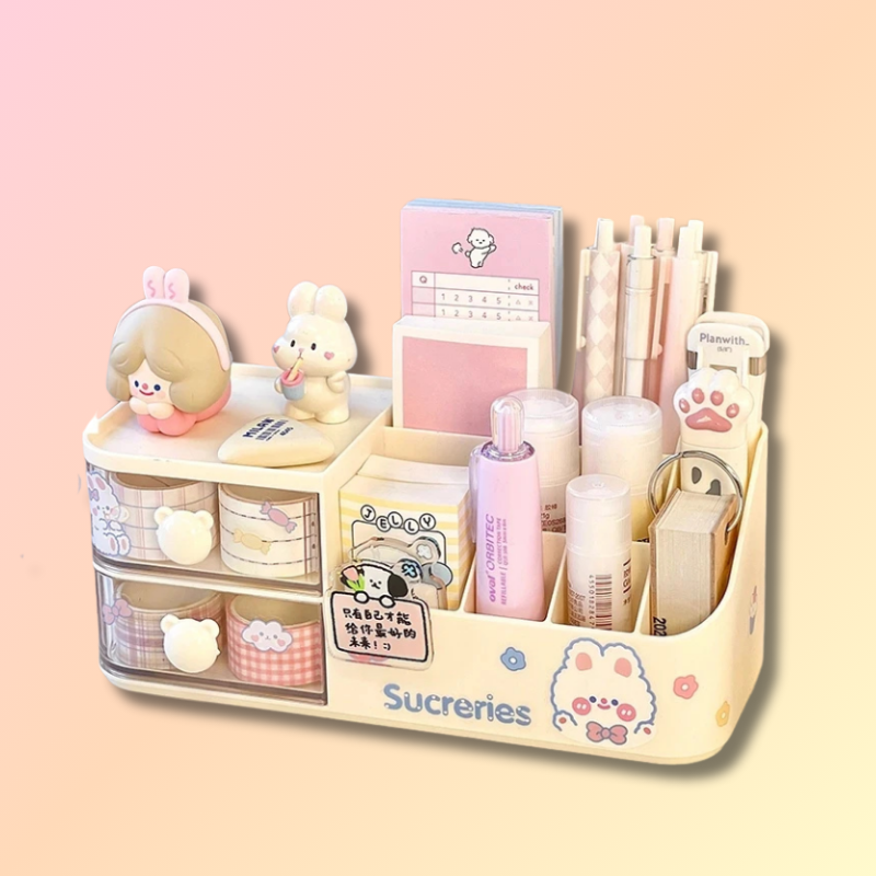 Keep your workspace neat and adorable with this cute desk organizer, featuring handle drawers and compartments for pens, sticky notes, tape, and more. Compact yet spacious, this storage box helps you stay organized while adding a playful kawaii touch to your desk, making studying or working more efficient and enjoyable.